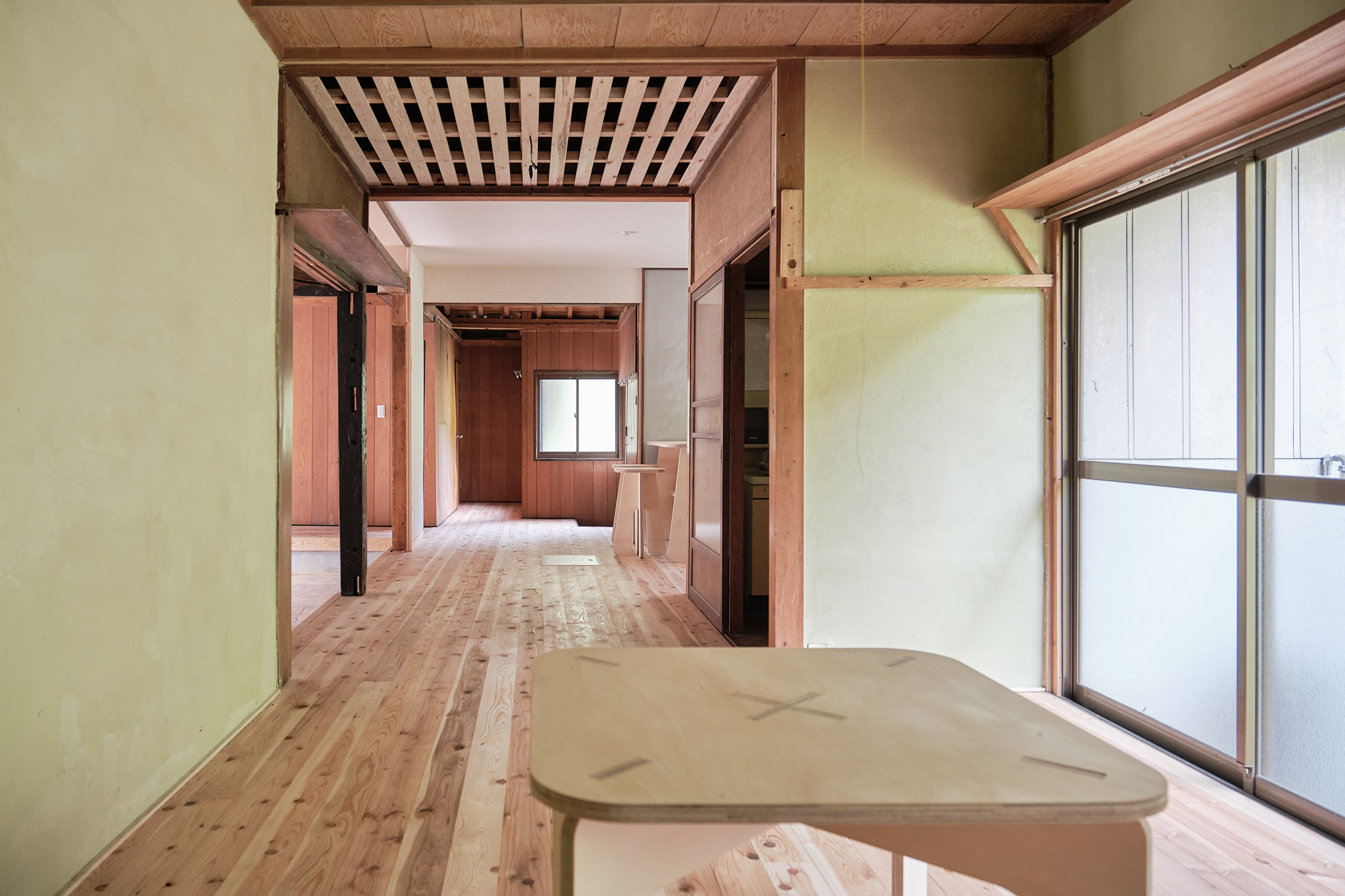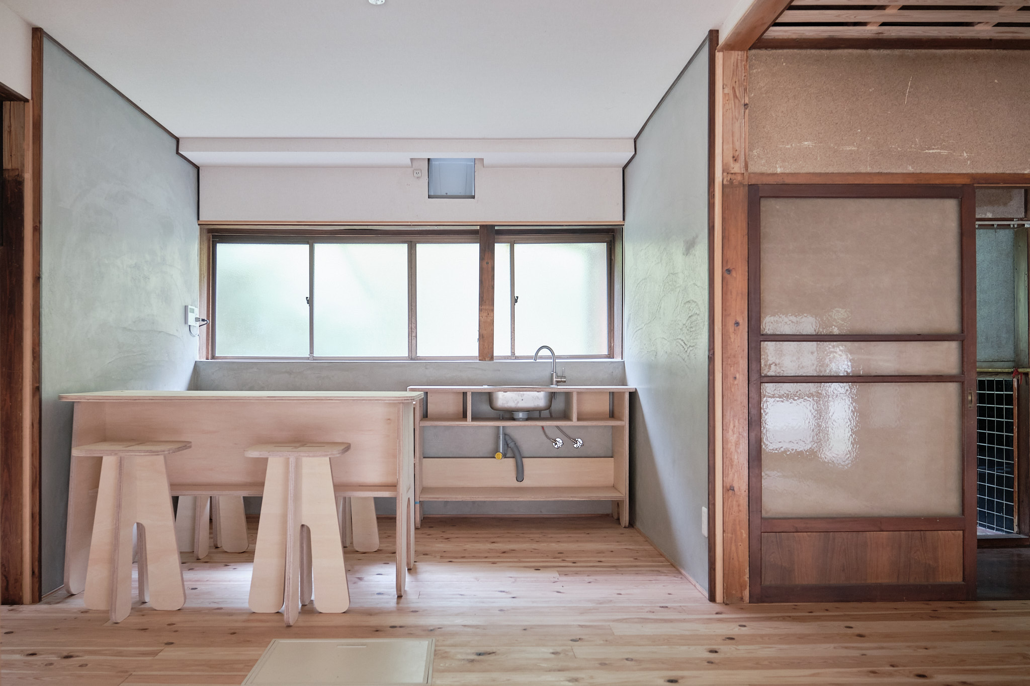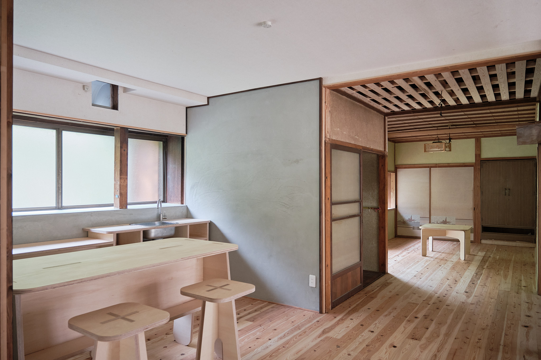 八女市・八女観光協会が上陽町の活性化を考えており、その中で空き家があるから、それをリノベーションして宿泊できるようにして欲しいという依頼があった。リズムデザインの井手さんに手伝ってもらった。予算が限られていたので、屋根の最低限の雨漏りなどを直しほぼお金は消えて、床をやりなおし、土間をみんなでワークショップでつくった。そして、什器はバレちゃんが設計してくれて、CNCで抜いて調整して組んだ。簡易的な改装だが、リズムデザインの井手さんの監修によって十分すぎる気持ちが良い空間となった。横が星野川に入る川で、とても気持ちが良い。