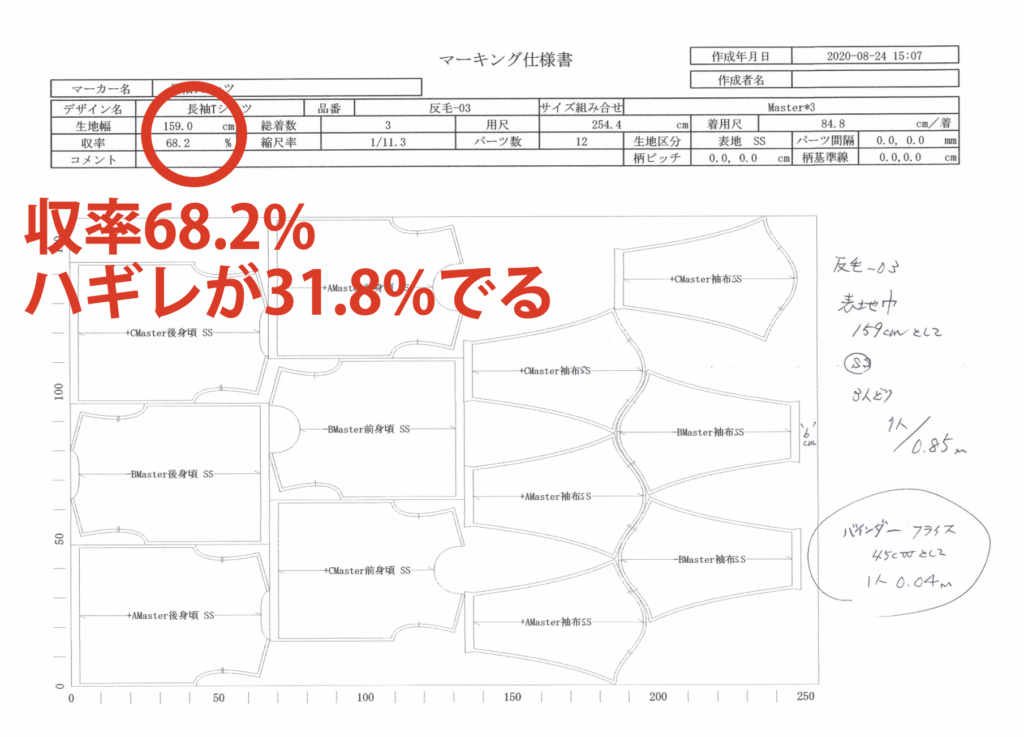 例えばある服だと、ハギレが31.8%もでる。立体裁断の服である限り、100%取れるという洋服はおそらくほぼなく、ハギレが出る。