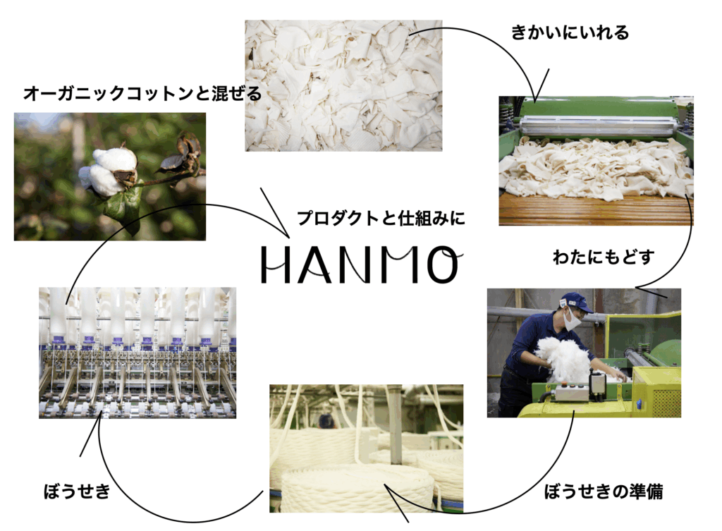 HANMOプロジェクトの仕組みは上記の通り。ハギレを綿に戻し、紡績の準備をして、紡績し、オーガニックコットンと混ぜて、服にする。