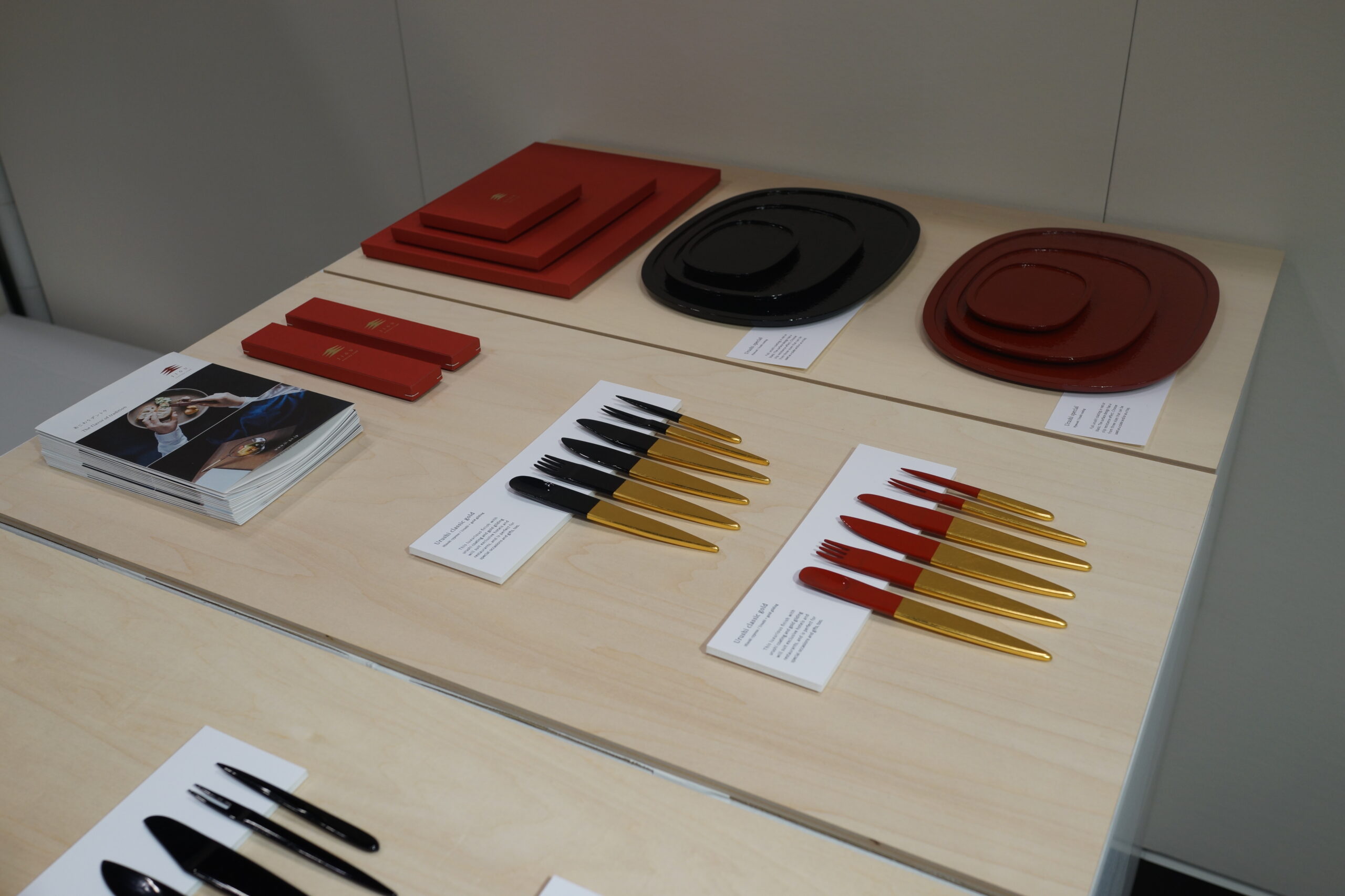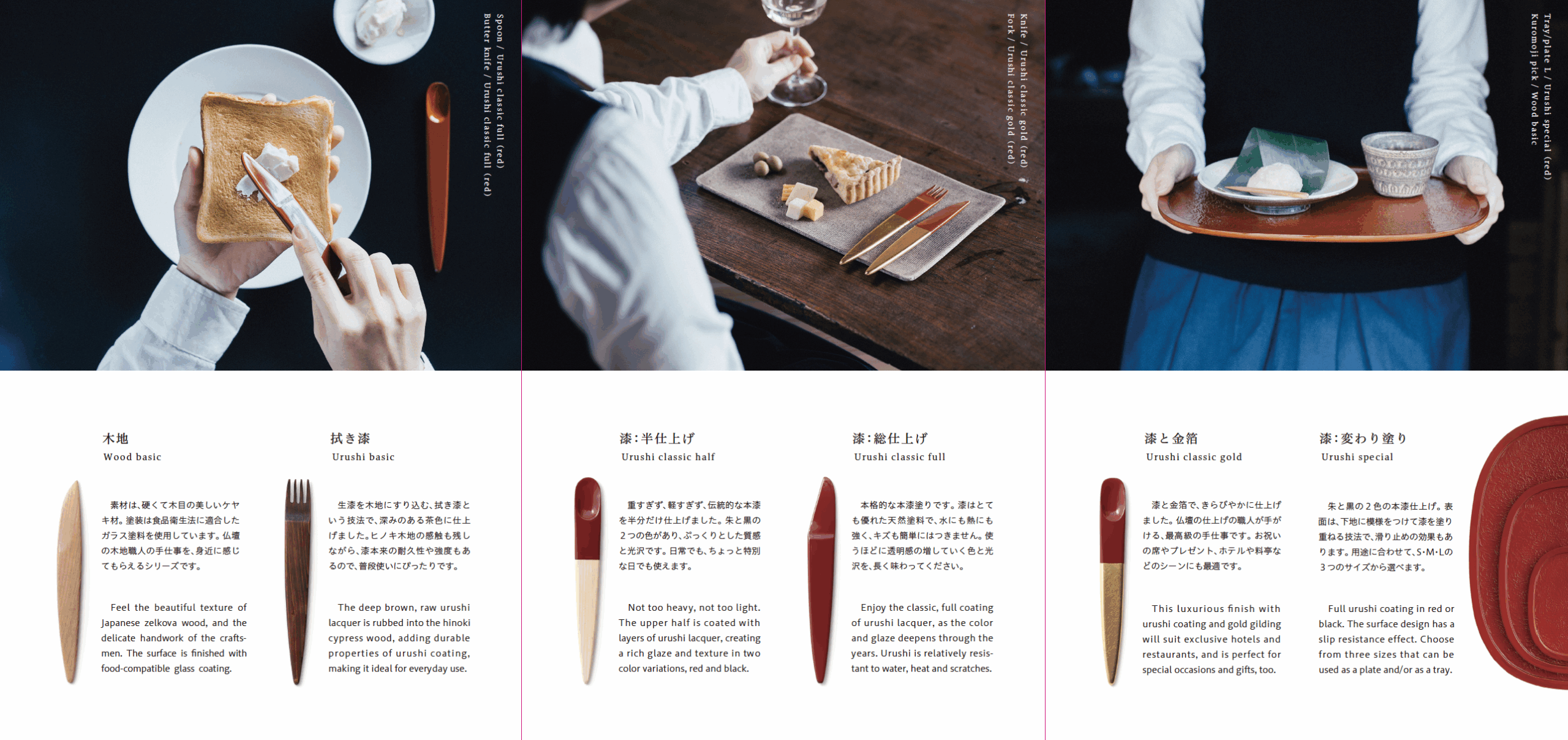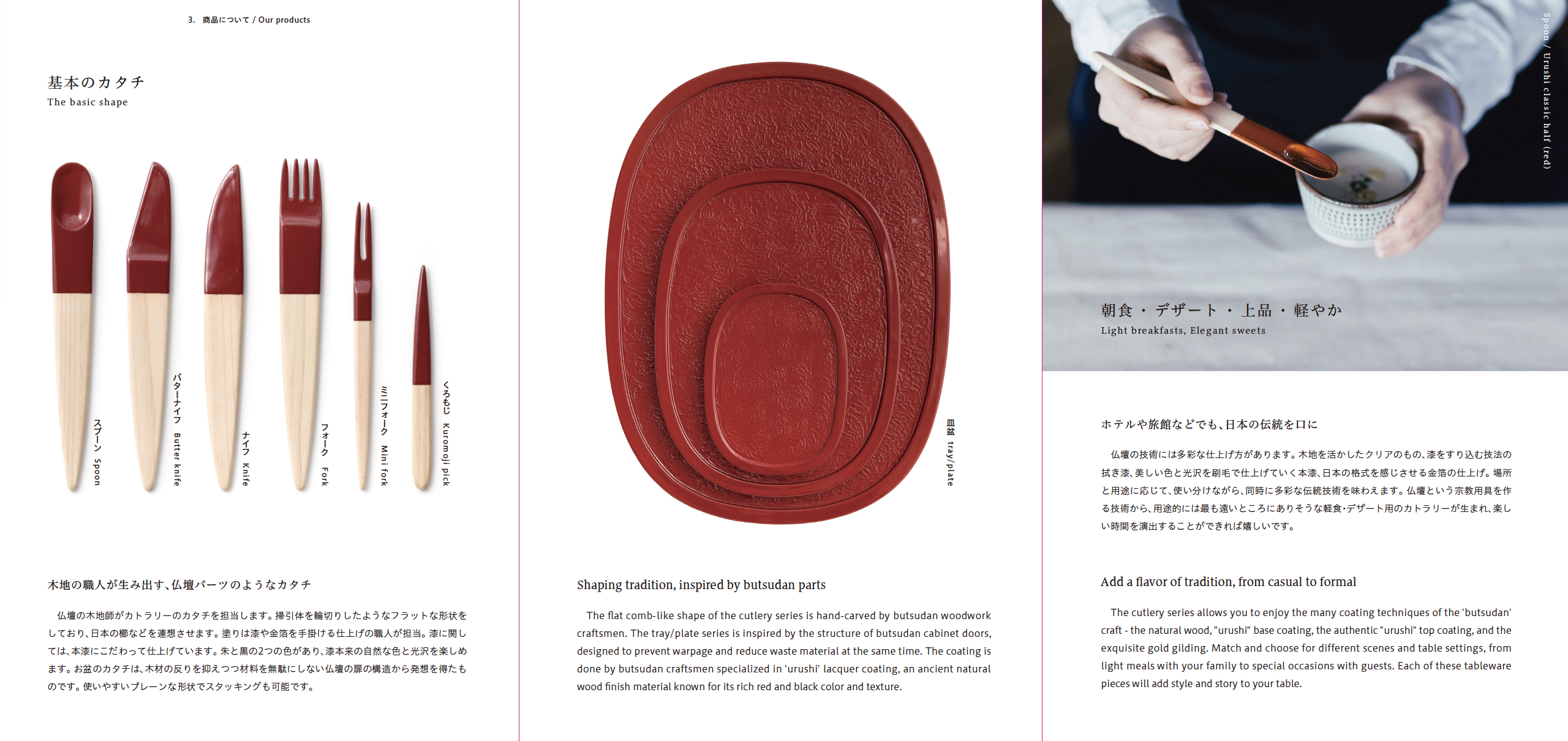仏壇の製造プロセスには「木地・宮殿・彫刻・蒔絵・塗装・金具」と工程がわかれる。今回はその中で木工を扱う木地、漆や金箔を塗る塗装をベースにして、そのプロセスをカトラリー・お盆という形に落とし込みプロダクトを開発した。