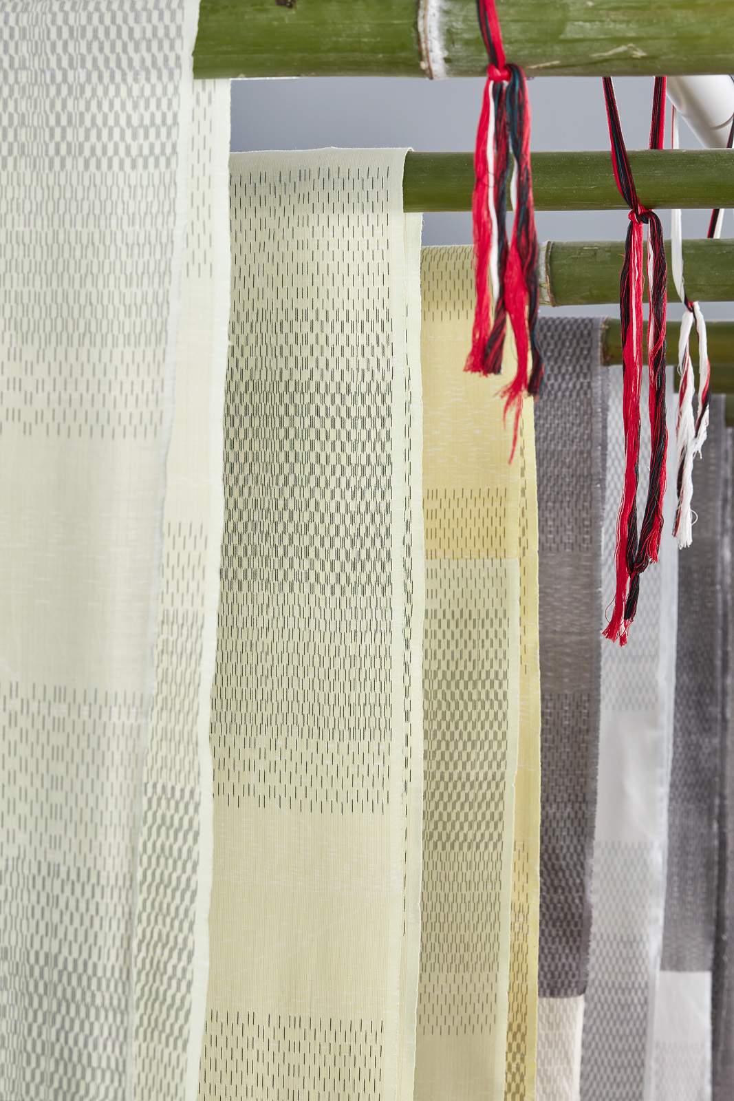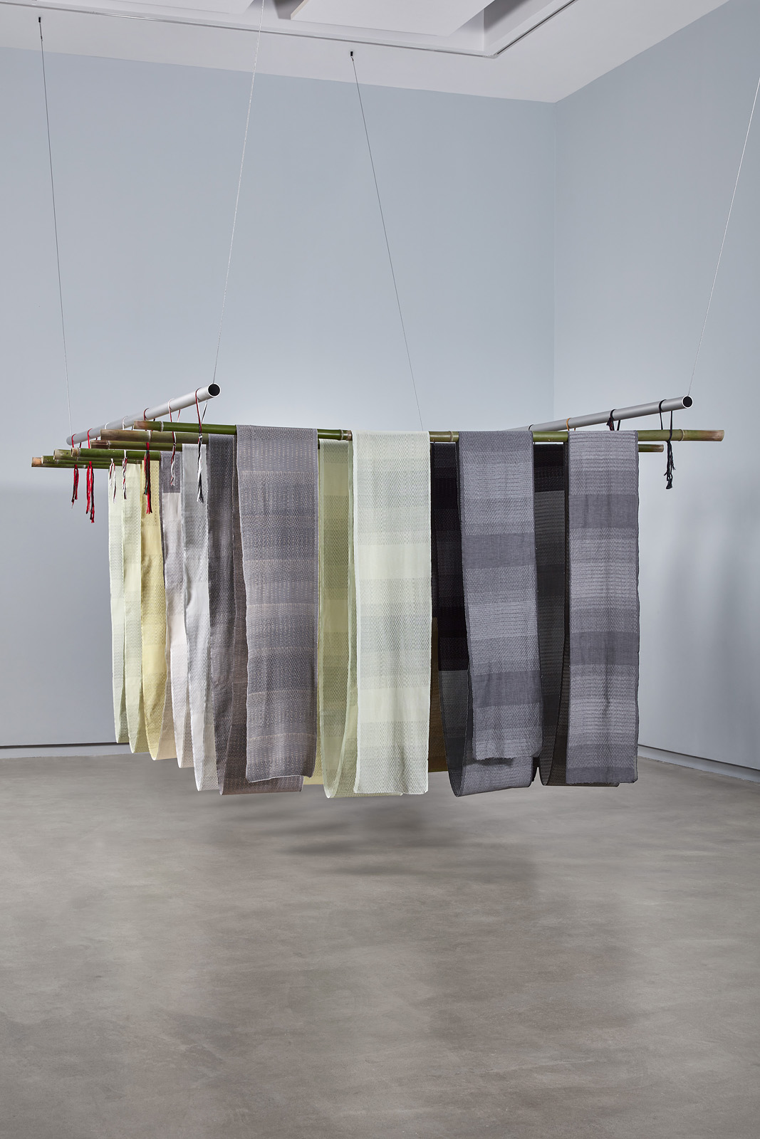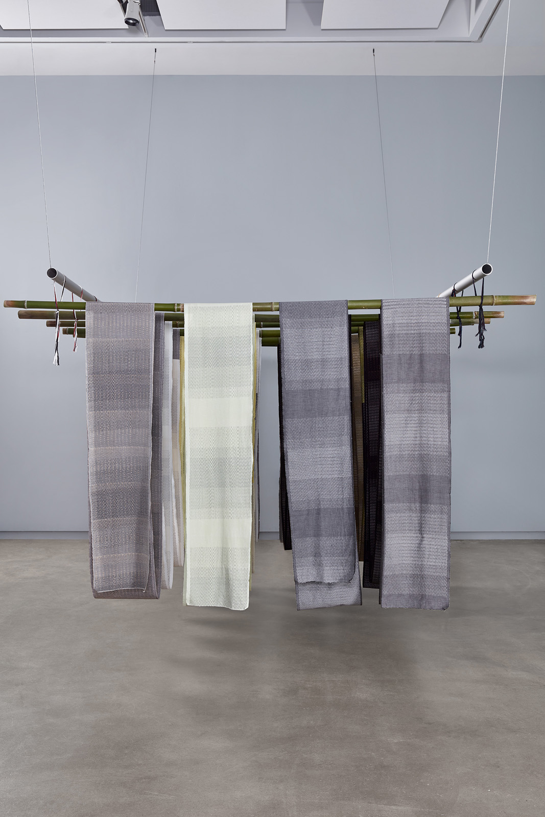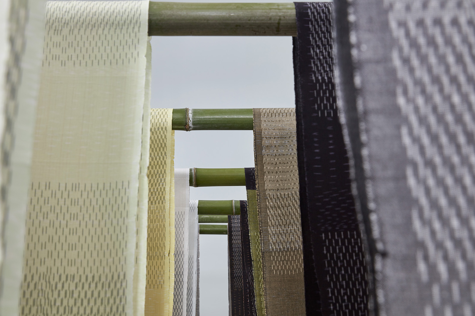 展示は、オランダのアイントホーヘンのVan Abbemuseum(ファンアベミュージアム)で行った。久留米絣の織元である下川織物さんの2Fで仕上がった布を干す段階からインスピレーションをうけ、都市と地域の間という意味も含めて、パイプと竹を組み合わせ、糸は久留米絣のプロセスででる糸を使った。美しいインスタレーションとなった。