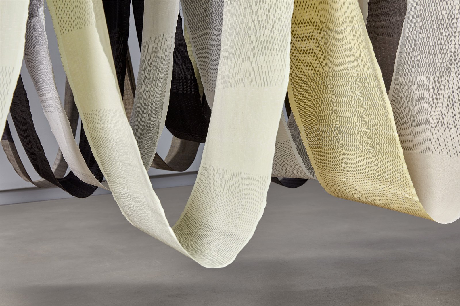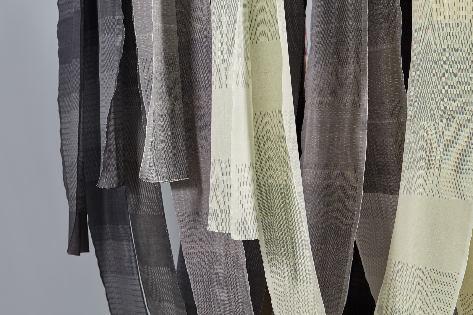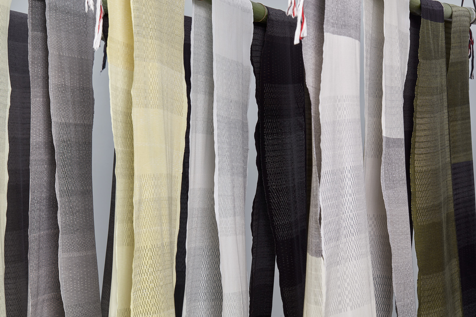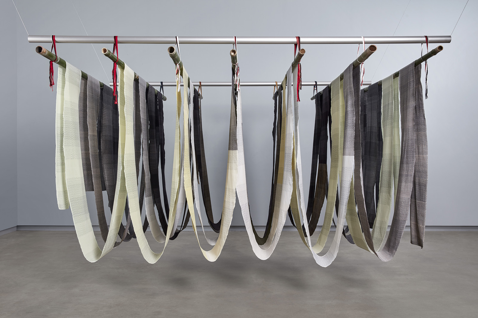 展示は、オランダのアイントホーヘンのVan Abbemuseum(ファンアベミュージアム)で行った。久留米絣の織元である下川織物さんの2Fで仕上がった布を干す段階からインスピレーションをうけ、都市と地域の間という意味も含めて、パイプと竹を組み合わせ、糸は久留米絣のプロセスででる糸を使った。美しいインスタレーションとなった。