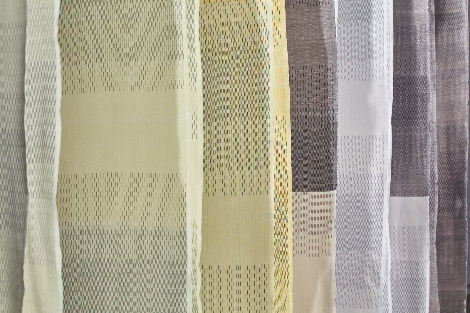 色はエミリの担当。感性がとても豊かですばらしい。彼女は日本を回ってきた中で、コンクリートの色や、自然の色や、ビニールの色、いろんな色をサンプリングしてきて、それを16色だったか?にわけて、そこから色をつくっていった。よこ糸をさまざまな色に染め分けて、テキスタイルの色を構築していった。
